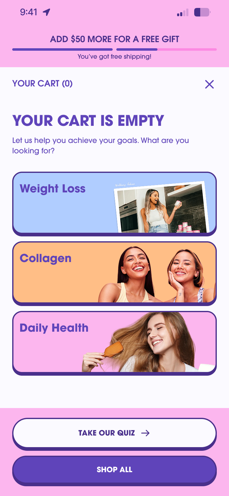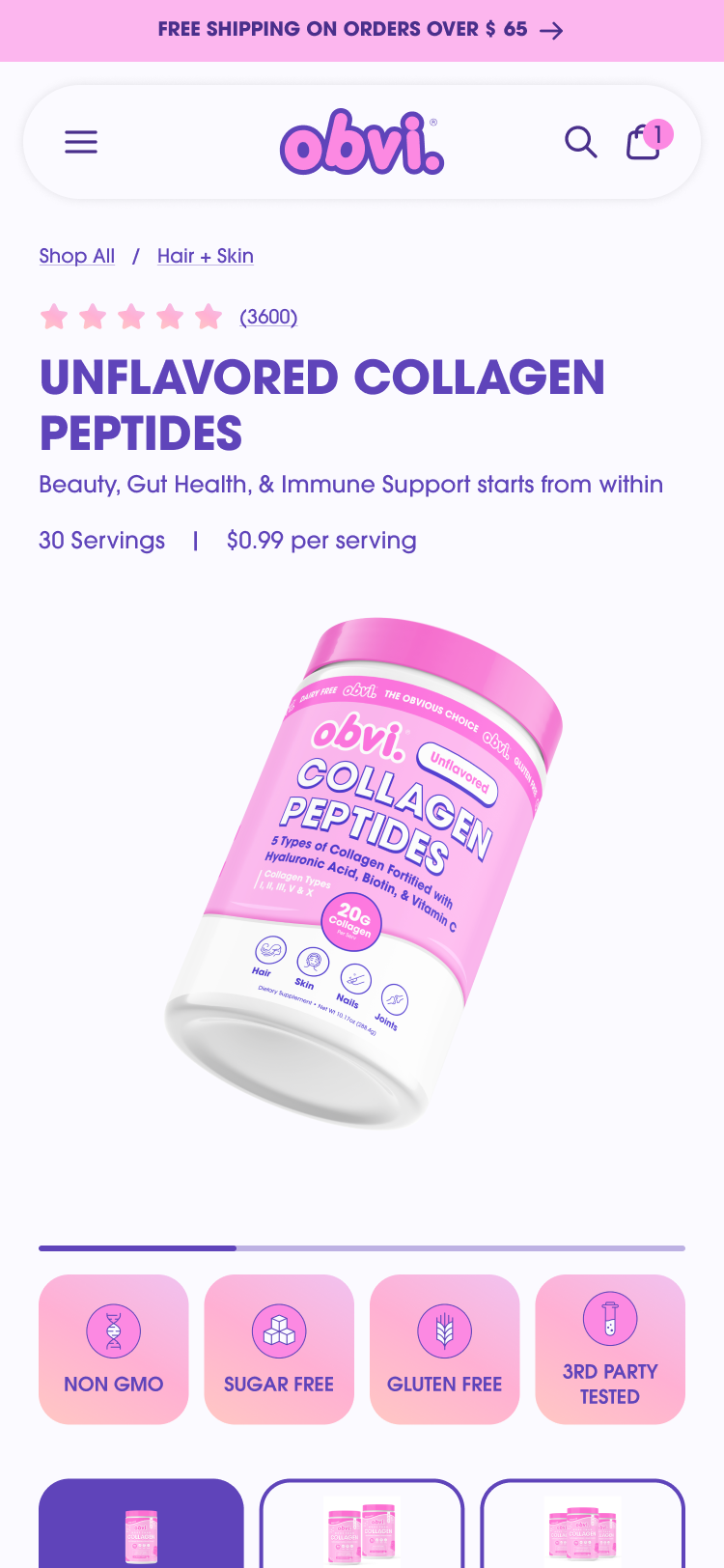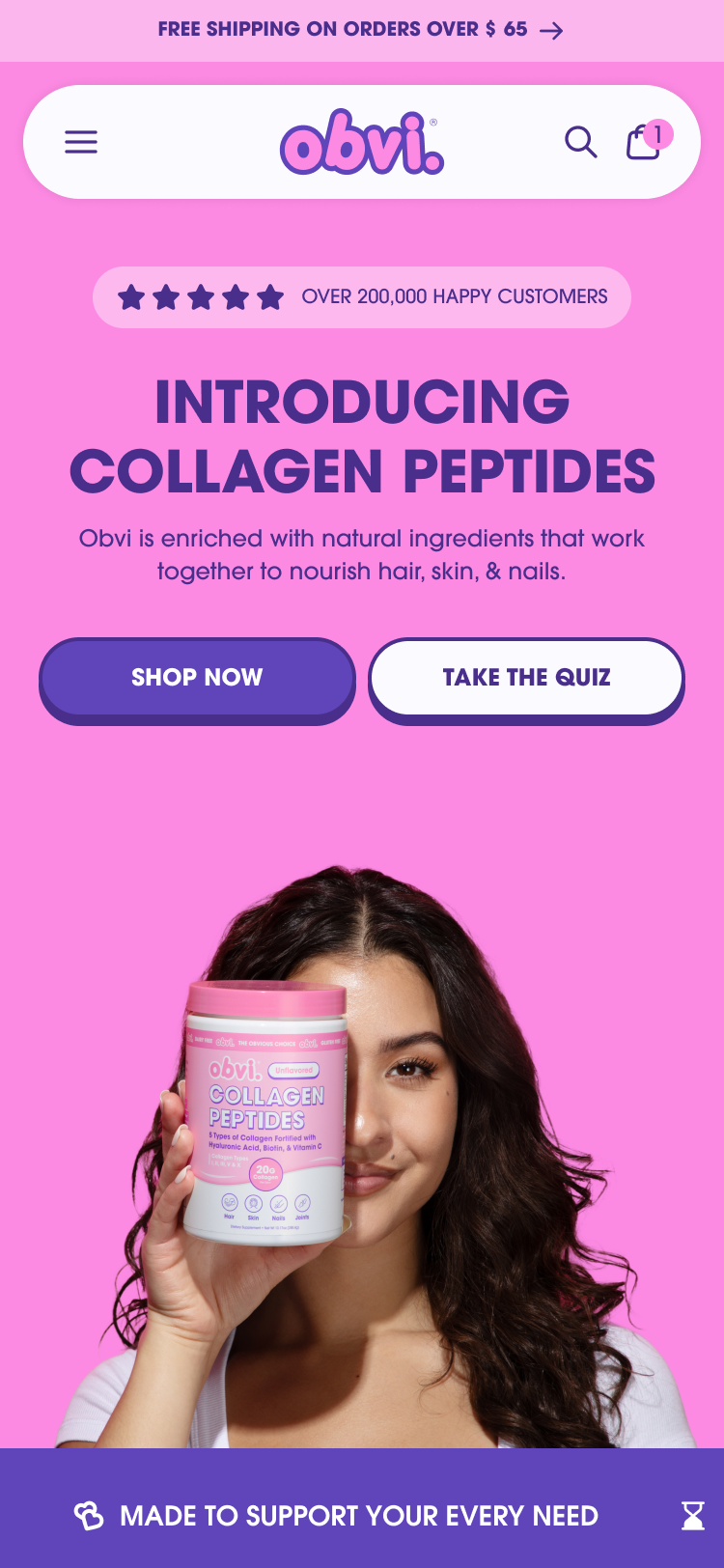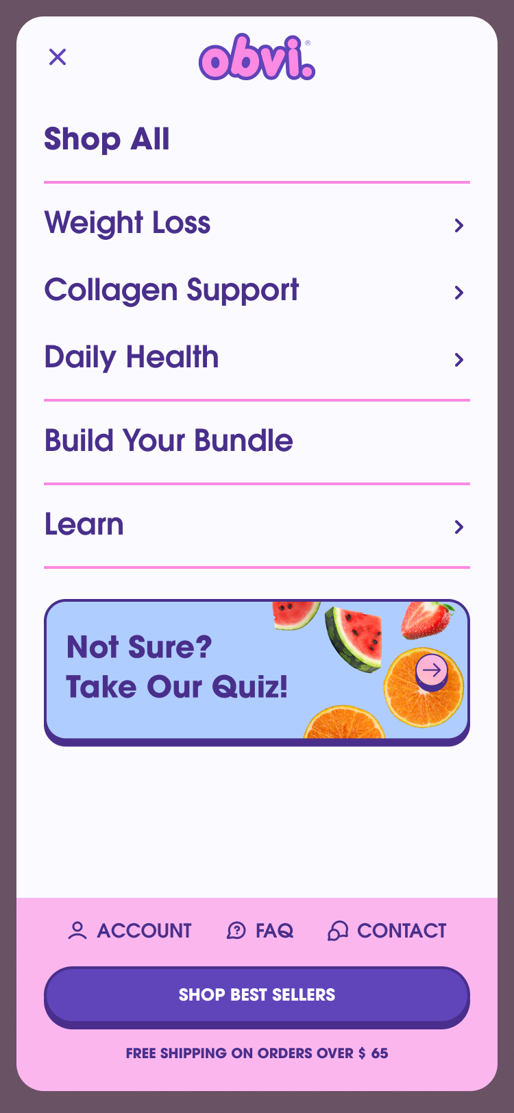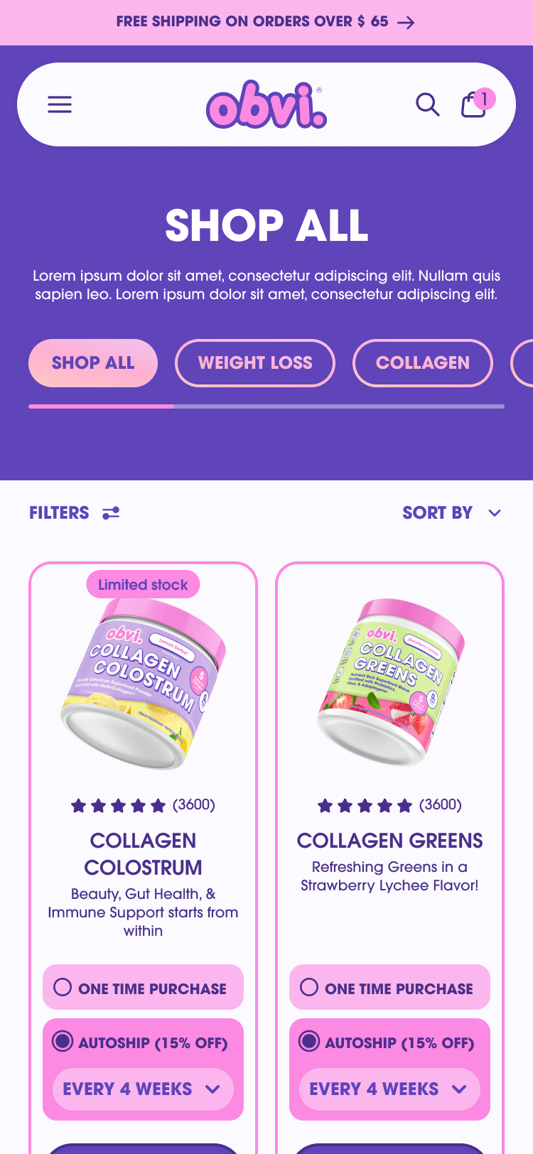 Throughout the rebuild, the storefront was redesigned to better reflect Obvi’s brand through subtle animations, bright color treatments, and flexible layouts, all while reducing bloat and improving performance.
